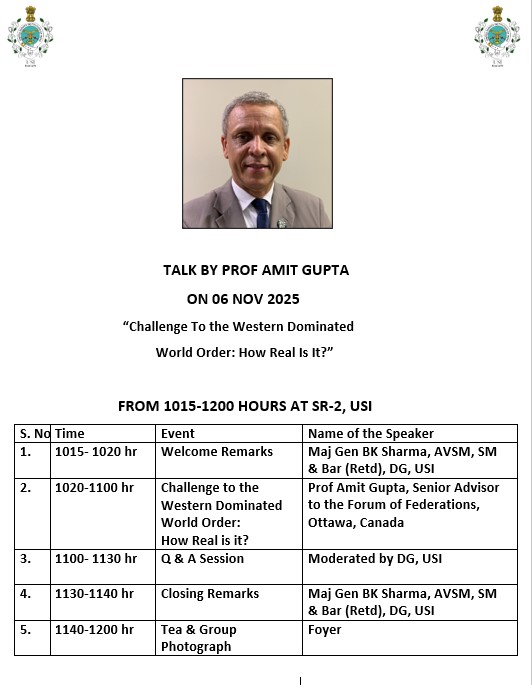 The United Service Institution of India (USI) continues its tradition of fostering informed debate on global strategic affairs through its flagship series of high-level intellectual engagements. As part of this ongoing endeavour, USI is hosting a distinguished talk on 6 November 2025 by Prof Amit Gupta, Senior Advisor to the Forum of Federations, Ottawa. The session, titled “Challenge to the Western Dominated World Order: How Real Is It?”, will bring together scholars, practitioners and strategic thinkers to reflect on the shifting balance of global power and its implications for India and the wider international system. The event will feature an in-depth address by Prof Gupta, followed by an interactive Q&A moderated by the Director General, USI. Such conversations are central to USI’s mandate of enriching national strategic thought and contributing meaningfully to contemporary policy discourse.